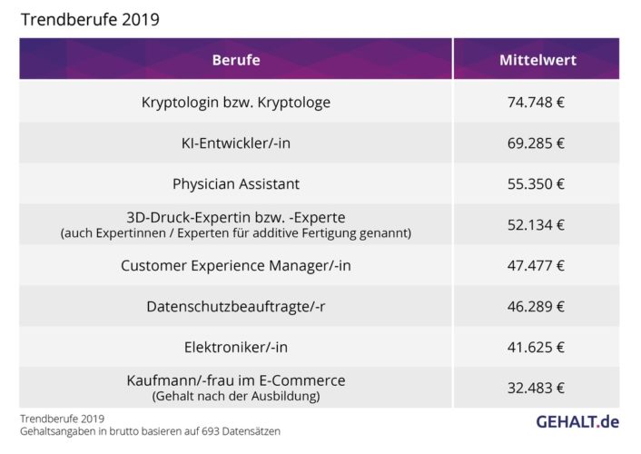 Die Experten von Gehalt.de haben die Trendberufe für 2019 gesammelt. Besonders gute Zukunftsperspektiven gibt es demnach im Handwerk, bei Entwicklern für künstliche Intelligenz und in der Datenverschlüsselung. Außerdem ermittelten die Analysten von Gehalt.de aus 693 Datensätzen die durchschnittlichen Jahresbruttogehälter in den jeweiligen Berufsgruppen.