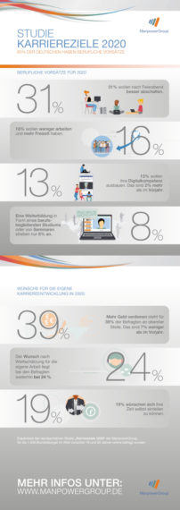 Über die Studiej: Die Studie „Karriereziele 2020“ basiert auf einer bevölkerungsrepräsentativen Online-Befragung von 1.030 Bundesbürgern. Sie wurde im Dezember 2019 im Auftrag der ManpowerGroup vom Marktforschungsinstitut Toluna durchgeführt. Mehr Informationen zur Studie erhalten Sie unter: https://www.manpowergroup.de/neuigkeiten/studien-und-research/studie-karriereziele/.